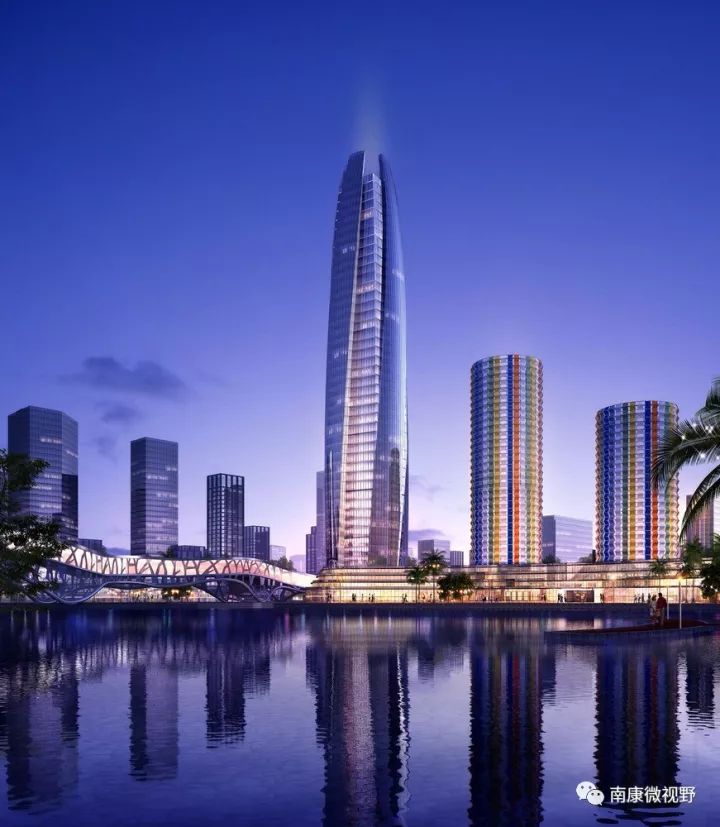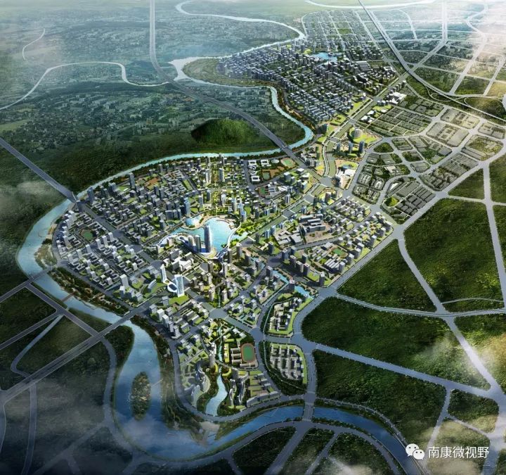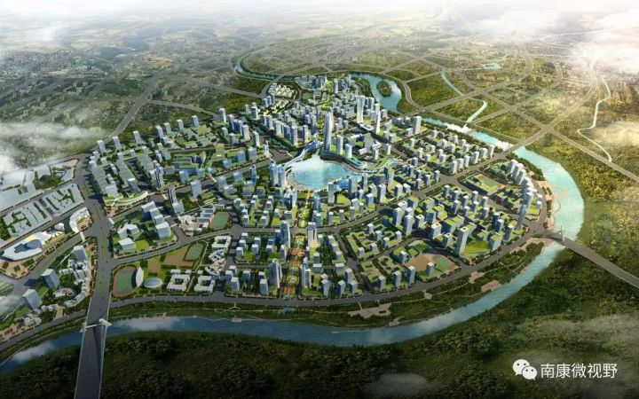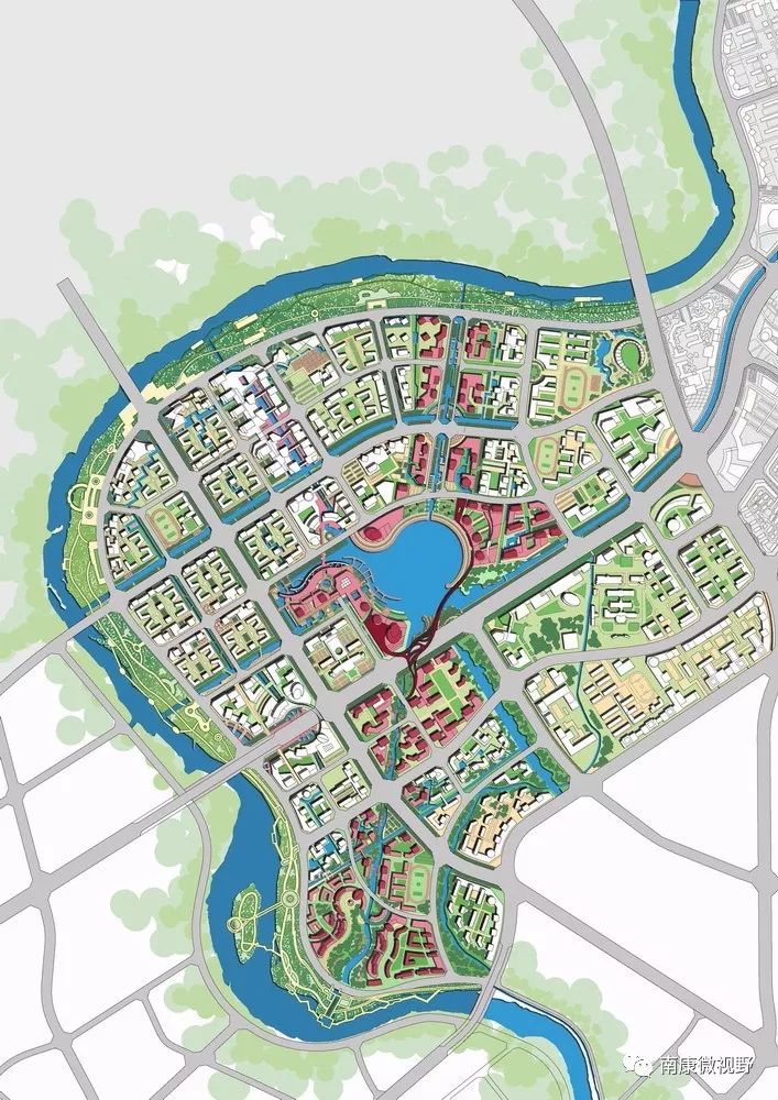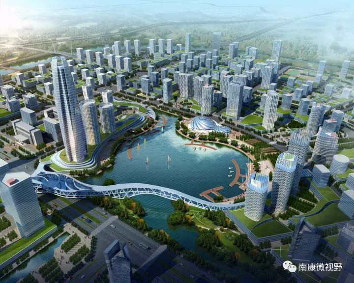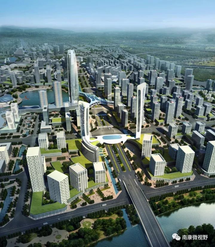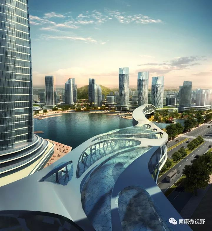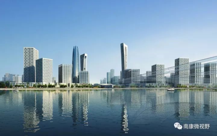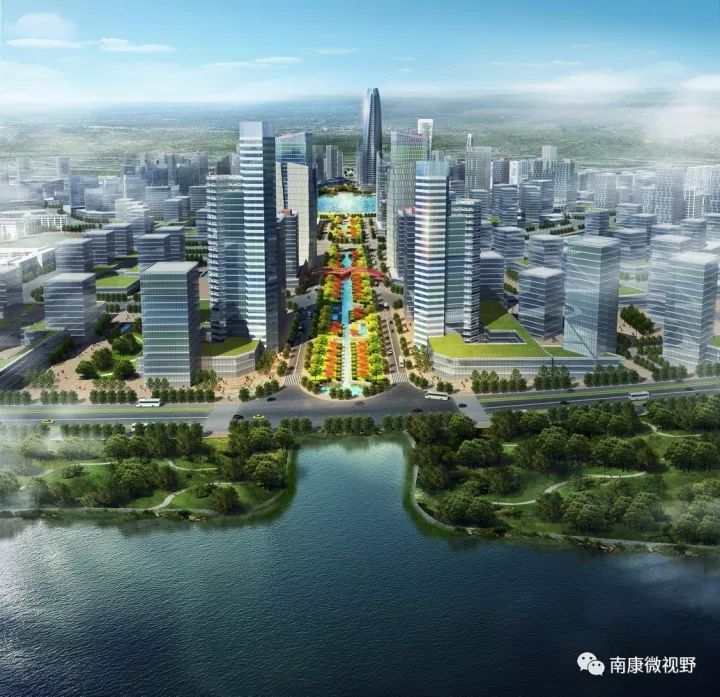 该规划创新性地提出了“引风入城”和“引水入城”的策略:“引风入城”是指顺应主导风向,结合城市道路和建筑空间布局,开设一条宽约120 m的绿轴风廊,在夏季将郊野的新鲜空气引入城市中;“引水入城”是指将章江水引入城市内部,结合场地内原有章惠渠、文峰河等水系,通过重力流在区内形成集江、河、湖、泾于一体的蓝色网络。“风”与“水”的结合,极大地丰富了城市景观,为新区的空间品质增添了灵性。在城市设计中还将绿地和水系有机结合在城市空间布局中,围绕章江沿岸景观、带状水系和中央人工湖,形成三层环状绿地景观,并通过风道和水系相连,大大提高城市居民使用公园的便利性。