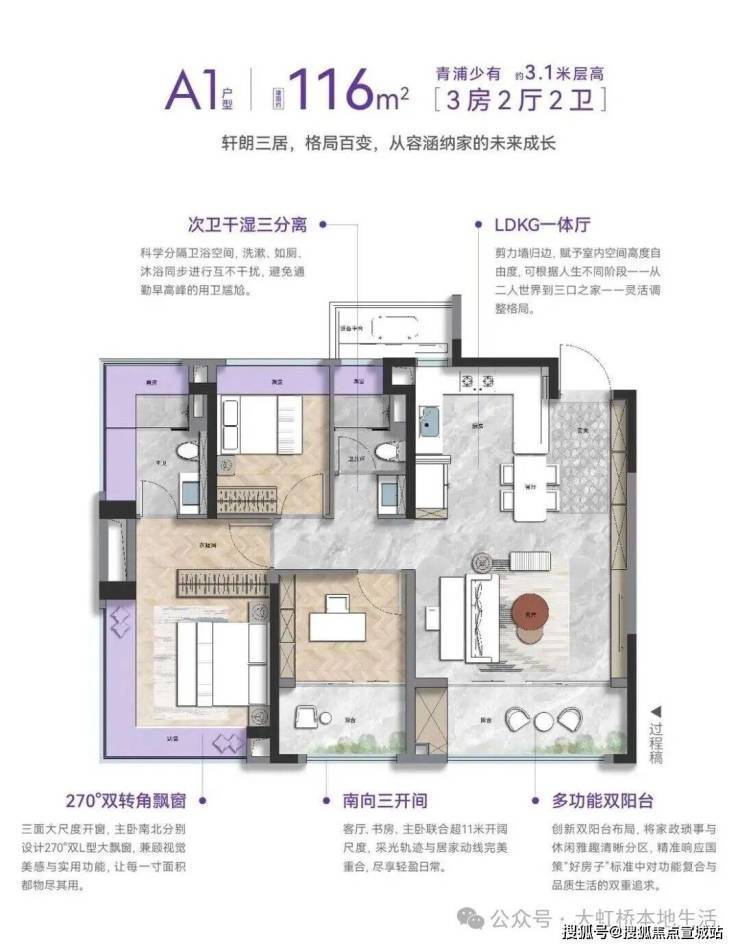 更难得的是,项目全系户型3.1米起步的层高,高于新规要求的3.0米,就算装了中央空调 + 地暖,空间依旧通透不压抑,彻底告别小户型的局促感。