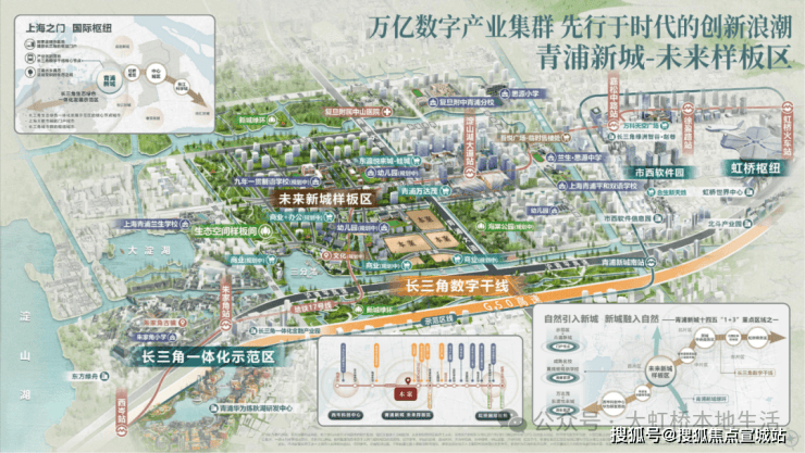 项目直线距离800米的17号线淀山湖大道站,坐落商业建面约43万㎡的青浦万达茂、东渡悦来城两大站前超级商业,再往东还有吾悦广场。