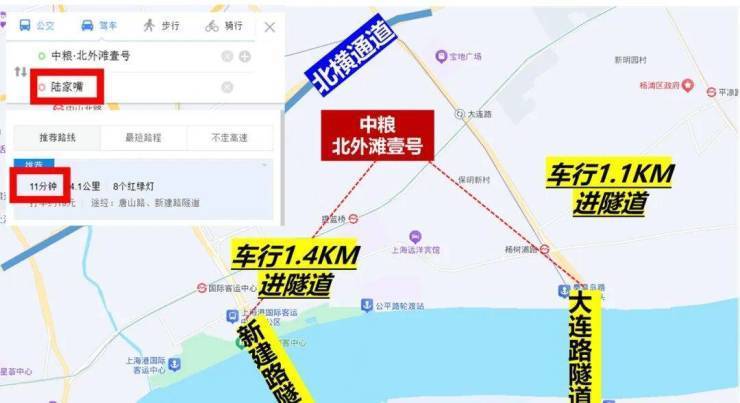 自驾上,项目往北约300米就是北横通道,往南车行约1公里,就是新建路隧道和 大连路隧道 直达浦东。从项目到陆家嘴、北外滩和外滩都在10分钟左右。