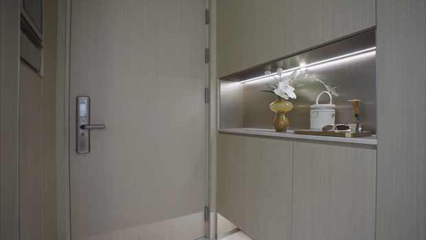 项目入户门采用高端品牌金凯德的钢木复合门,搭配金属不锈钢包边, 建面约106㎡门面面宽为1米,宽于一般入户门的90cm门框 ,并配备博世4合1智能密码锁,高端大气的同时方便大家具进出。