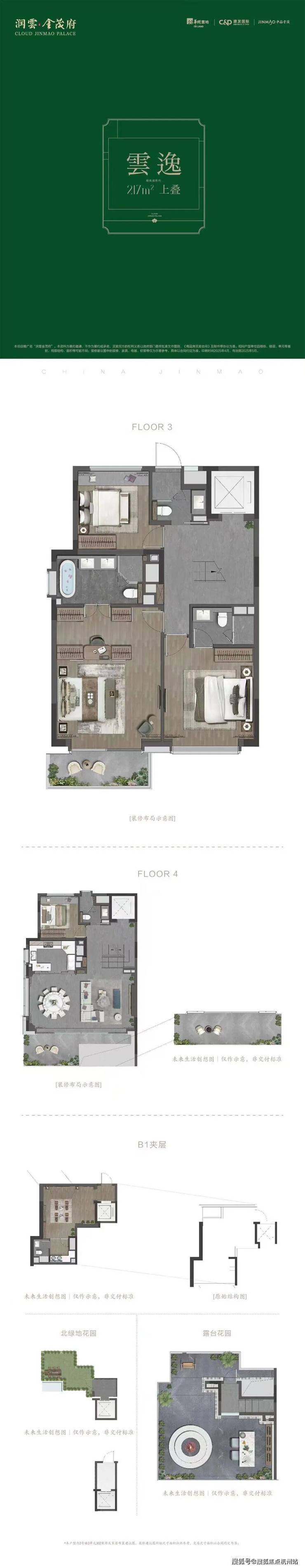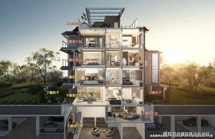 上叠从北绿地花园入户,经私家电梯直接进入3层或4层室内空间,或进入 B1夹层地下室。