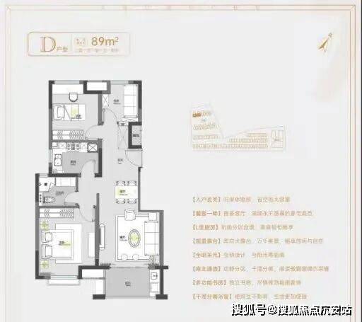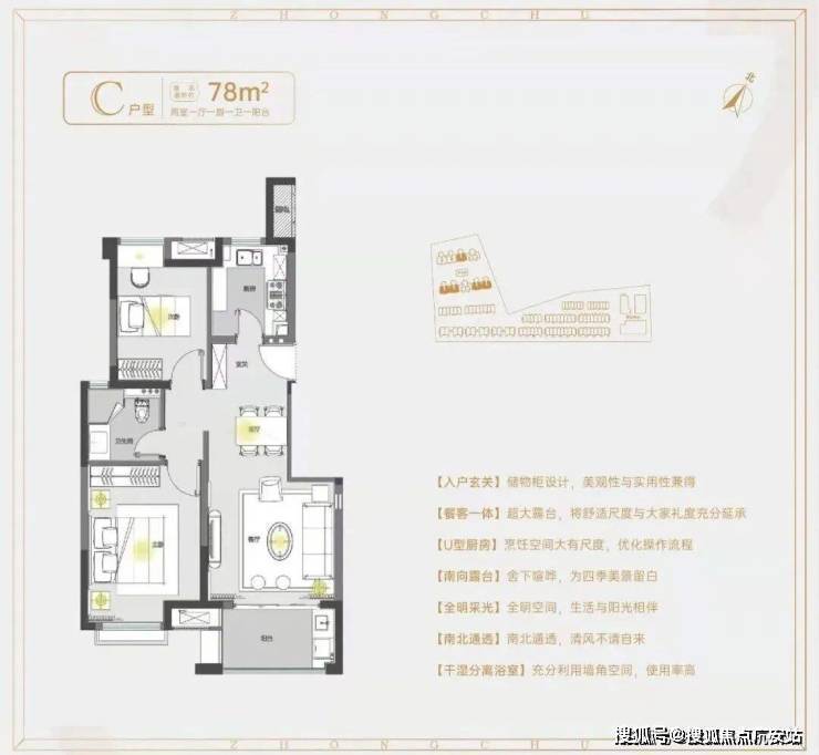 建面约78㎡2房1卫户型,做到了双开间朝南+南北通透+卧室带飘窗+动静分离,功能区划分、动线都非常清晰。