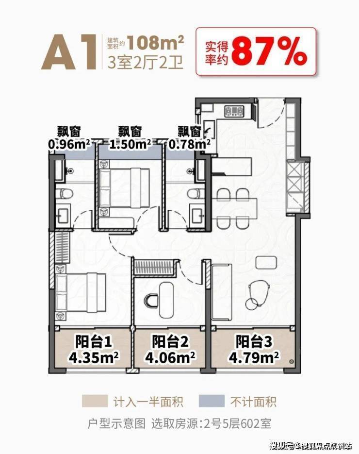 建面约108㎡3房,三阳台面积达约13㎡(赠送一半),飘窗赠送约3.3㎡,室内使用面积达约94.5㎡,实得率高达约87%,总赠送面积比常规次卧都大。