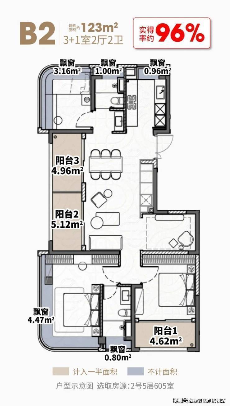 建面约123㎡4房,三阳台面积达约14.7㎡(赠送一半),5飘窗赠送高达约10.4㎡,室内使用面积约117.8㎡,实得率高达约96%,总赠送面积相当于两个次卧。