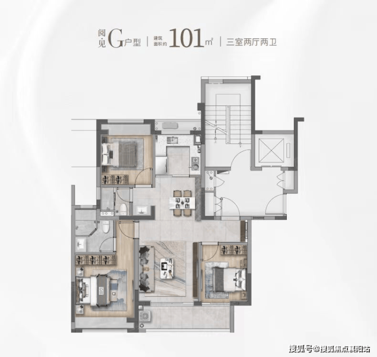 1. 建面约 101㎡三房两厅两卫(高层):主城改善黄金户型