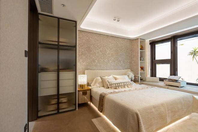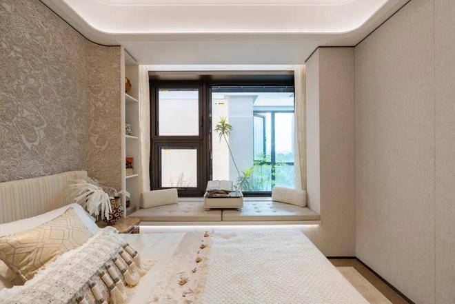 豪华的套房设计,北侧卫浴飘窗+南向床边双飘窗的设计,更是把这个空间的视野和收纳空间延展开来,尺度感真的很惊人。