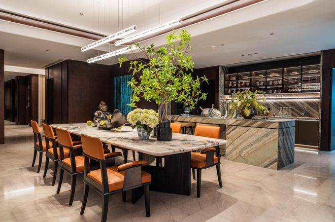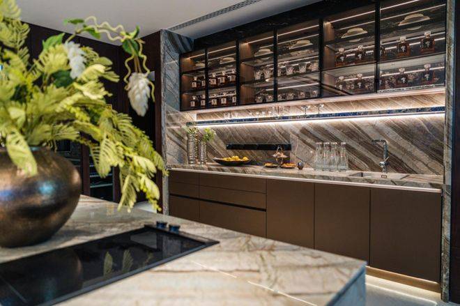 更细节的是,西厨吧台采用“东方木纹石材”,独特纹理与质感让每一次咖啡手冲都成为“生活美学的展示”。