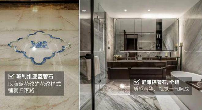 从私家电梯厅开始,地面局部点缀皇家蓝的玻利维亚蓝奢石,号称奢石中的爱马仕,并刻成海派花纹的样式,优雅又具仪式感。