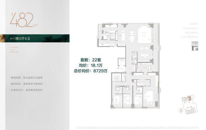 482㎡,3号楼东边套,均价18.1万,基本属于5房5卫,从这里开始,4个卧室全部套房设计,自带卫生间。