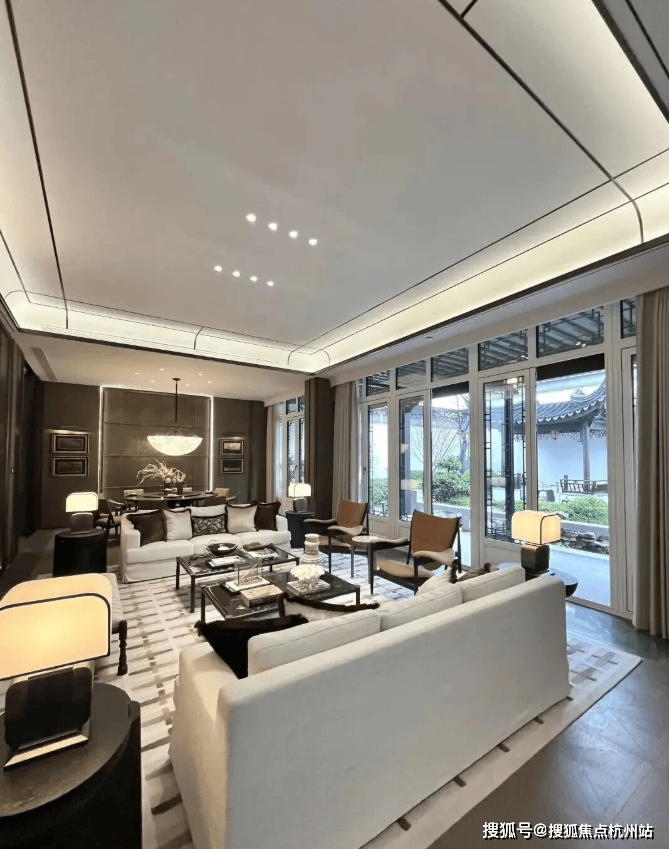 建筑内部,空间开阔大气,装修精致考究,将中式元素与现代工艺完美融合,既具古典之美,又享现代舒适。周边自然生态环境优越,水系环绕,绿树成荫。