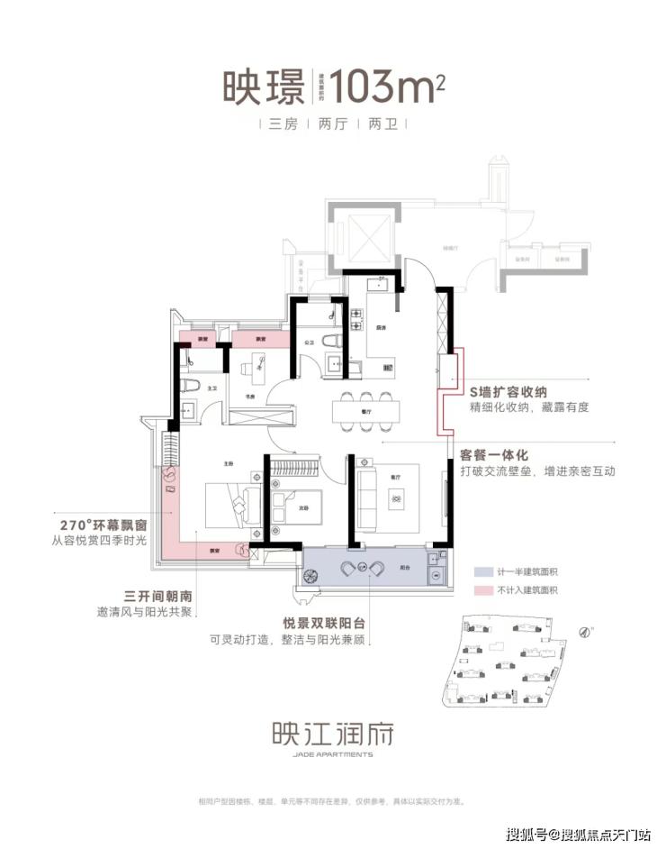 亮点五:双联阳台+多飘窗赠送、灵动空间 。映江润府103户型,实现了100平级别难得的双联阳台,实现了室内空间的横向延伸,同时,搭配主卧、主卫、书房的“全飘窗”设计,赋予了空间更多灵动的使用场景。