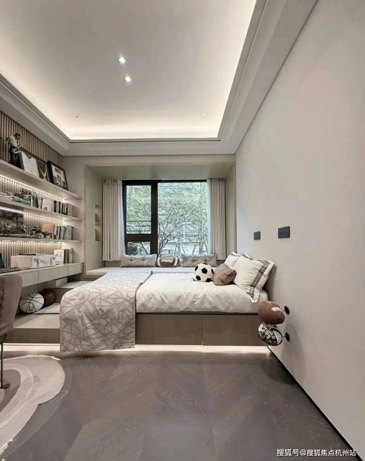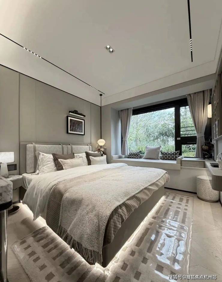其中主卧的270°转角飘窗就有约5.7m²,通过与外立面的结合,直接做了梳妆台和储物柜,拓展了飘窗的实用性。