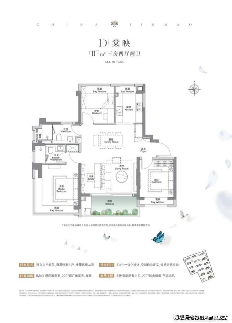 建面约105㎡3房2厅2卫,做到了三开间朝南+4个飘窗+双面阳台系统+主卧套房设计+270°转角飘窗,附加空间非常多。