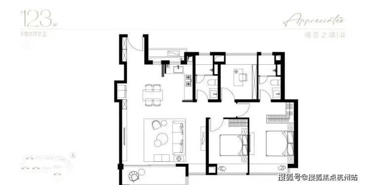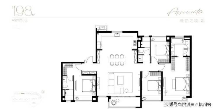 主力建面105-198㎡,3-4 房,得房率77%-82%,空间利用率高