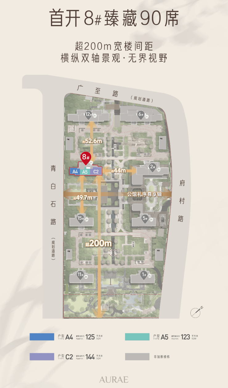 首开楼栋确认,将推出8#楼王,双轴景观环绕,享超阔楼间距最长约200m,建面约123-125-144平王牌户型即将过会。