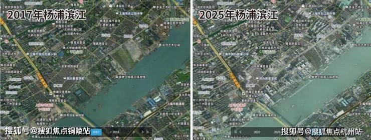 作为黄浦江畔的压轴板块,杨浦滨江的建设速度是有目共睹的,下图是2017-2025年杨浦滨江的卫星影像变化图,几乎是一年一个样!