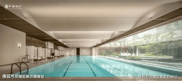 最后来看泳池。云邸玖章做了再升级。改为采用大尺度的落地玻璃拼接,约2.4米宽巨幅玻璃,且通过精致的玻璃交接细节处理增进室内外空间的融合,强调泳池的无界感,真正实现了无边泳池的效果、质的飞跃。
