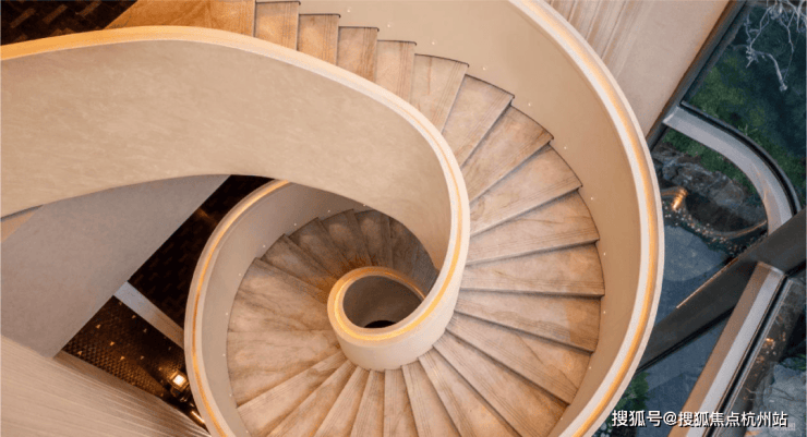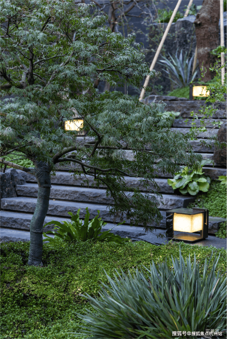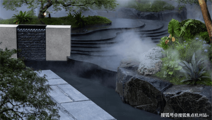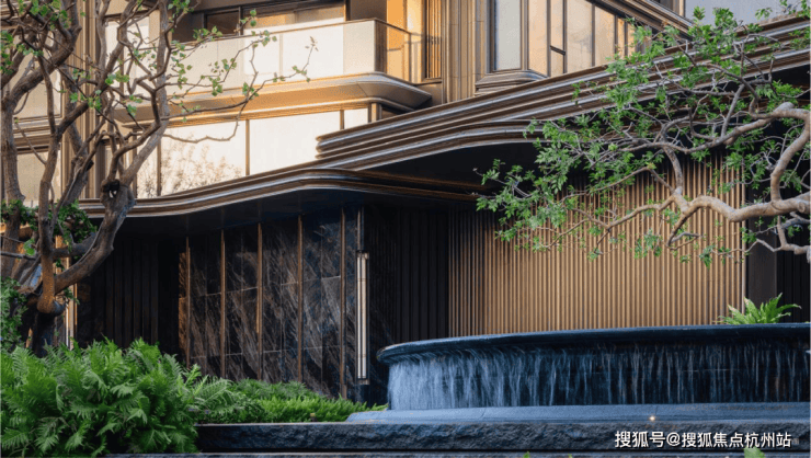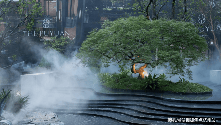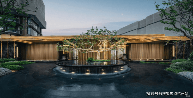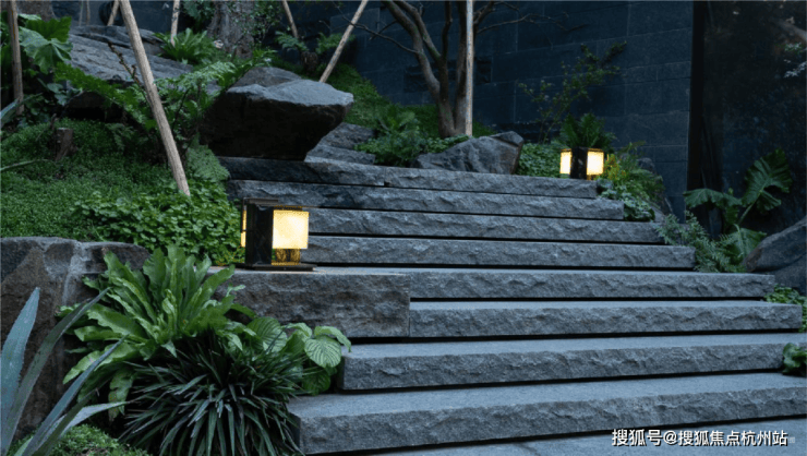 而实景首开的近2000㎡下沉庭院,作为“园林灵魂”,漫步此间,你会看见:乌金原石围合的“玉扣绿岛”上,低调静放着团队自“天下玉源”河南南阳历时遴选而来,近7000年的“国玉” 独山璞玉,与山野林木共此氤氲灵气,尽显东方温润;从诗经走出来的近 11m高参天乌桕,则再现古诗中所描述的“秋林城郭画图中,乌桕千株照眼红“的诗意;采用约6.7m幻影蓝奢石打造的“叠级水瀑”跌水台,池底以呈现天然墨绿色泽的蓝金刚石铺就,映水之澄明,境之悠远;连台阶都采用了“黑色花岗岩之王”安哥拉黑整石,沿云梯而上,让人返璞内心东方......