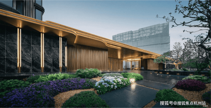 门庭隐现墨绿色泽的「璞熠琉璃」背景墙,经800℃高温淬炼,三十昼夜退火降温,无数遍打磨抛光,光影流转间熠熠生辉;特邀非遗传承人、福记世家第五代传承人夏志平,用十指抟砂古老手工艺独家定制的「璞釉艺陶」,搭配金属釉质感窑花纹理点缀,尽显温润高级。背后为呈现世间至美陶色,一片陶更历经了百次淬炼,配方调整,1280℃高温均匀铺釉。7.5m冠幅的百万级「百年冬青」,乃团队跨越6省17城,百次实地勘察,从近万棵名木中,万里挑一甄选而出,枝干苍劲充满力量;水盘池底的「流金银河」奢石,浓缩着来自宇宙的浪漫,以水刀行纹,让东方的银河让自上而下,层层倾泻。