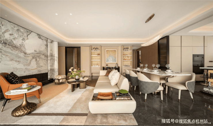 还是陈列凝固时光的琳琅艺术品,在静谧光影中叩击心灵的「游心艺廊」;融合艺术之美与镜湖春晓奢石的「灵石旋梯」;应季更迭典雅艺术花卉的「禅意花房」;吧台嵌入静湖春晓、银河流金奢石的「东方客厅」,以及吧台两端突破传统“工艺美术”框架,运用玻璃钢材质、肌理贴金箔、虹口掐丝工艺打造的「流光织梦」铜织锦艺术雕塑;巨幅玻璃移门可全部打开,尽赏庭园山水自然画卷的「四时画廊」