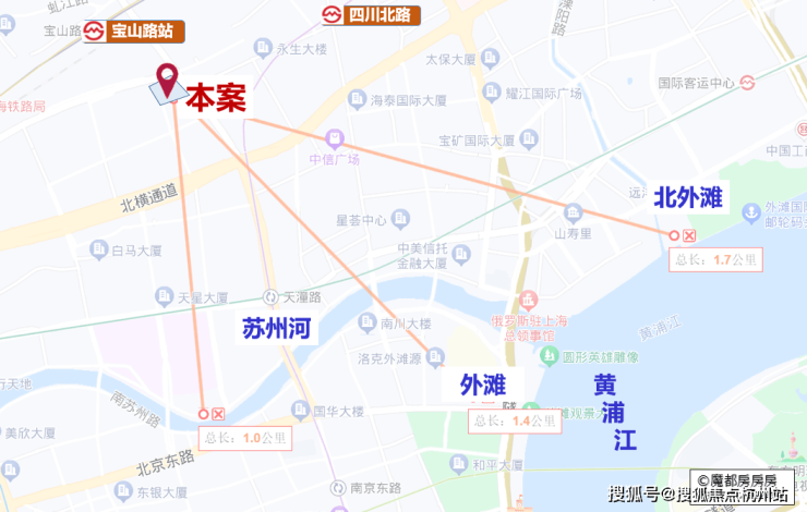 『静安里』该地块直线距苏州河约1公里,直线距外滩约1.4公里,直线距北外滩约1.7公里,直线距3/4号线宝山路站约300米,直线距10号线四川北路站约560米。