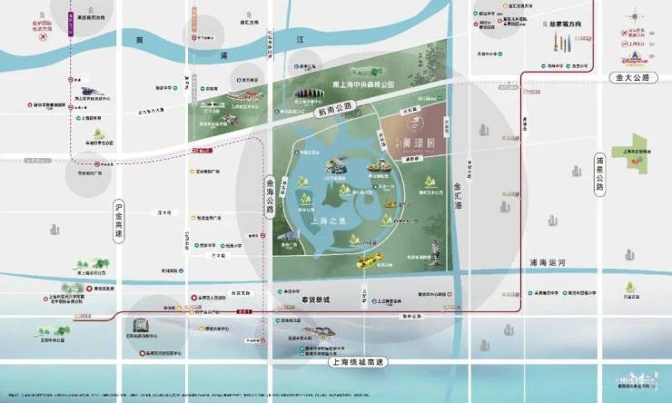 项目位干上海之鱼内,东侧是极具特色的金汇港,水脉碧波倒映生态景观。坐拥约万亩林地,占地面积约4.78平方公里南上海中央公园,更拥享上海之鱼约13公顷环湖景观带和集艺术展览、活力健身、娱乐休闲、游憩观赏为一体的现代城市公园群。