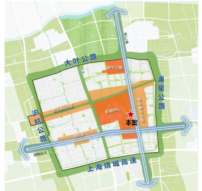 •田字绿廊:S4高速公路、东方美谷大道与新城四至围合而成