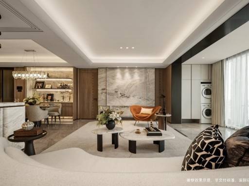客厅:6.75-7 米横厅、芬迪蓝奢石背景墙、通铺星耀灰石材