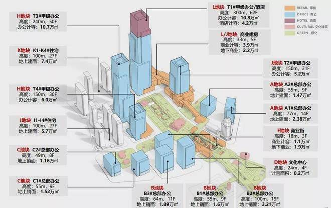 复合业态:约46万方超高层地标及高端企业总部办公楼,约17万方大型商业中心,约4.2万方星级酒店,约12万方高端住宅,约5万方公共绿化,、滨江文化休闲空间等文化功能配套。