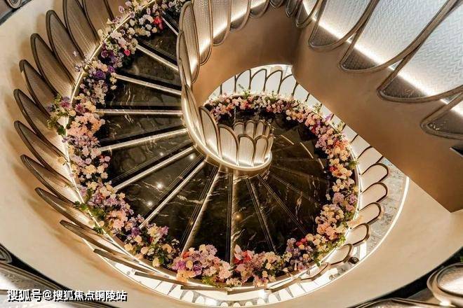 摩登旋转楼梯。楼梯已经贴上了定制的叶片状玻璃栏杆,朦朦胧胧的透光感,将会所旋梯的审美力,又拉上一个全新的高度。
