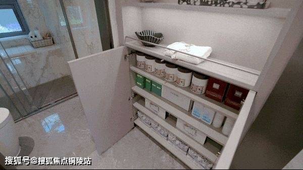 第二处卫浴s墙,大概一掌深,但是立面面积足足多了2平方米!超薄柜收纳有多强?一打开所有的东西琳琅满目,整整齐齐。而且另一侧的凹位也能得到很好的利用。