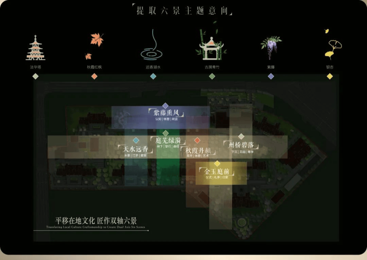社区内布局“礼序归家轴+景观漫步轴”纵横交织的双轴景观动线,将州桥老街、秋霞圃、远香湖、古猗园、紫藤园、银杏古树等嘉定六景提炼、转译,形成了具有在地文化特色的六大景观主题空间!并以此形成整体约300米的景观纵深,未来将呈现出一个超大的中央公园。