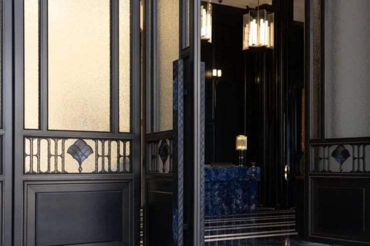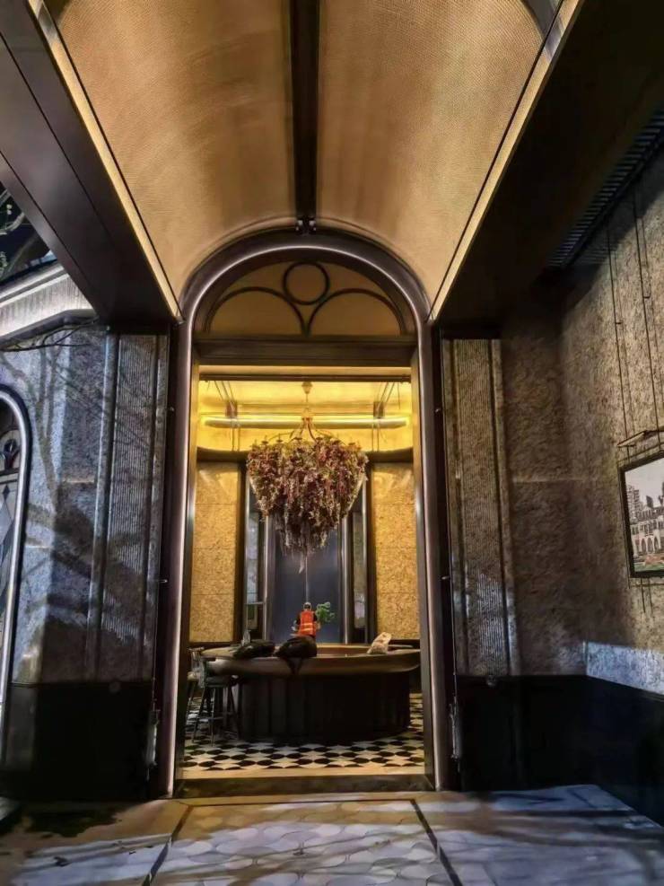 而在上层,则采用了上海海鸥丽晶酒店同款立面石材——巴西金;大门的门扇部位以高超的陶瓷镶嵌铜丝工艺,配纯手工掐丝珐琅贴片的精制拼贴。