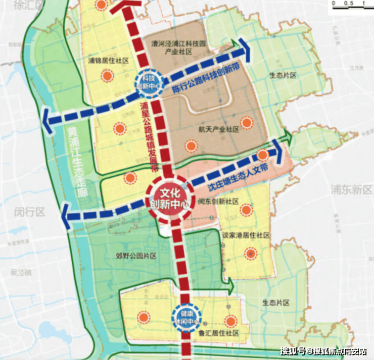 但浦江的未来潜力,不局限于如此。2035规划中,浦江镇定义为闵行中心城区,打造“一廊三带三心”空间布局: