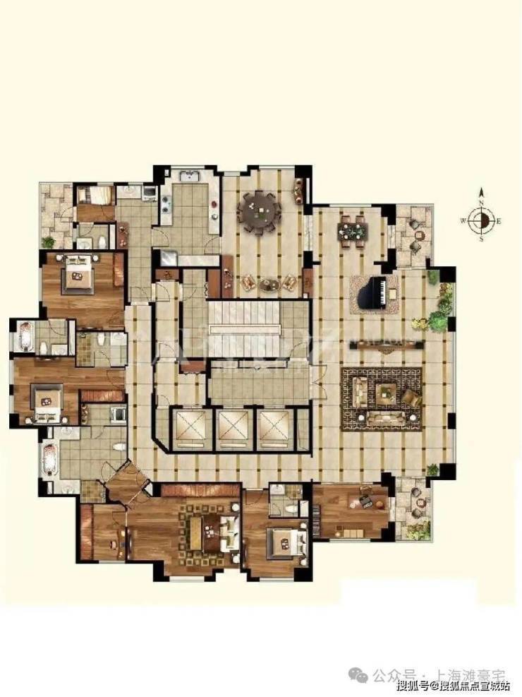整个户型呈现“回”字型,寓意回家,四周是功能区,中间是三部电梯,其中两部是主人电梯,从东向客户入户,一部阿姨电梯,从西边阿姨间的位置入户