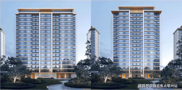 现代风格: 立面利用大面积玻璃+阳台落地窗+金属型材+层间装饰提升建筑整体感和精致度,外立面大面采用浅色仿石多彩漆,浅灰色金属格栅,浅灰色玻璃,香槟色金属型材收边形成创造出建筑独有的人与自然、动静结合、丰富美观的轻盈质感,彰显住宅品质