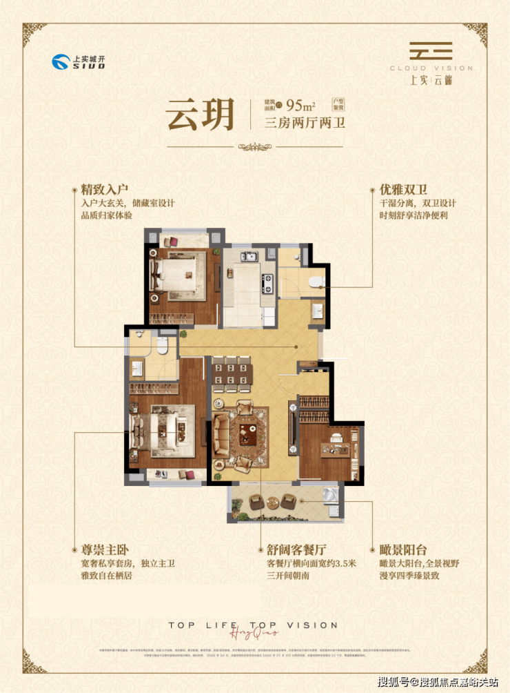 项目目前只剩95㎡的三房两厅两卫户型在售,95㎡的户型宽适,尺度感完全不输市面上百余平的三房户型。