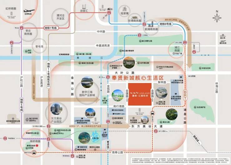 一、滨江南,近市区。金汇离人民广场直线距离仅约28km,对于工作在徐汇、闵行,或者浦东中环附近的人群,通勤便捷,自驾可通过浦星公路接入南北高架路。