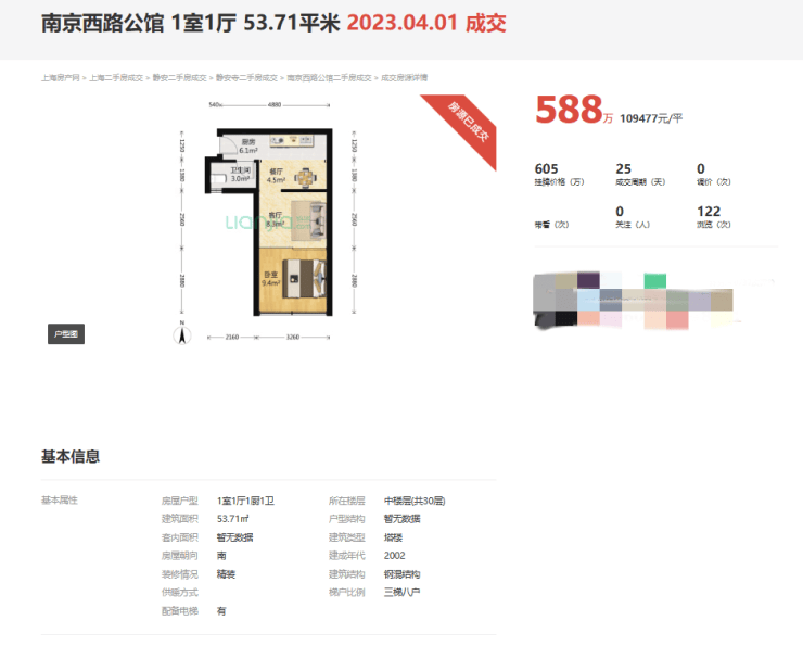2023年4月1日,项目成交了一套53.71平一房,成交价588万,成交单价10.75万。