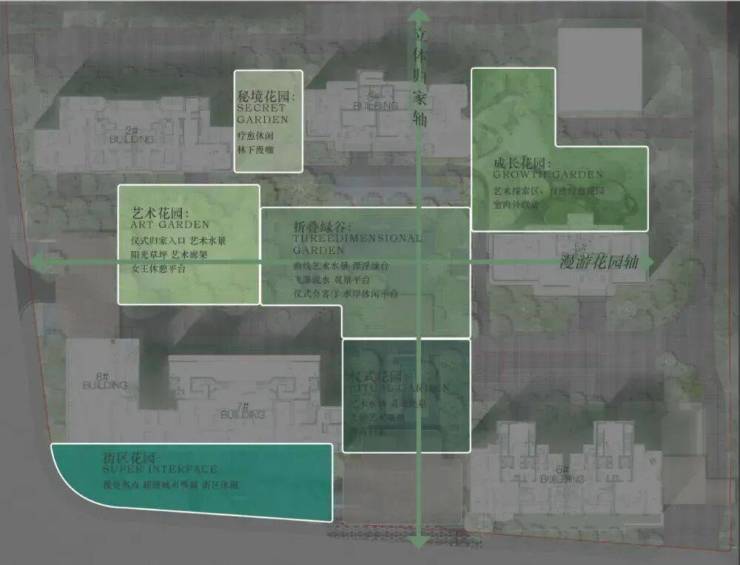 设计灵感源自新加坡艾迪逊酒店与《天空之城》“漂浮的拉普达”,以 “双轴五园” 为架构,打造约108米南北立体归家轴、约90米东西漫享花园轴,串联仪式花园、下沉庭院、儿童乐园、秘境花园、艺术花园五大花园