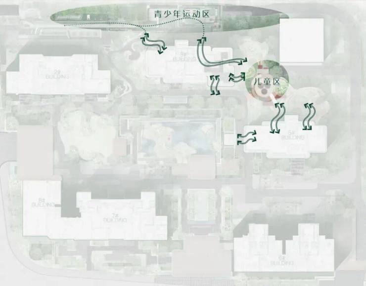 室内外无界渗透,青少年运动场、宅间花园、儿童乐园与架空层的无界联动体系,打造无界交流共享空间 , 弱化交界面,室内外共享 , 形成园区功能互通;从儿童到青少年到成年人的全龄无界互通