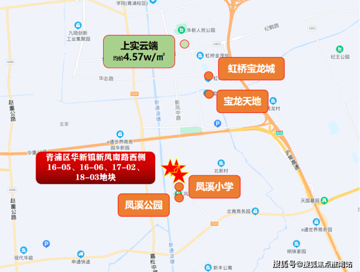 项目地块位于青浦区华新板块,周边暂无轨道交通,商业有虹桥宝龙城、宝龙天地,学校有凤溪小学等。项目周边新房有上实云端,均价4.57w/㎡。