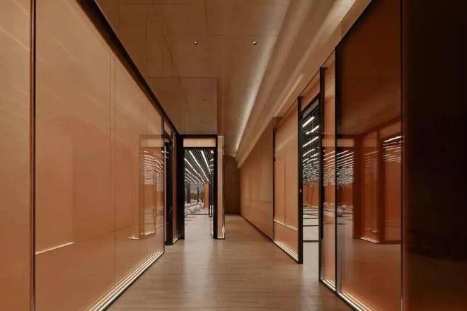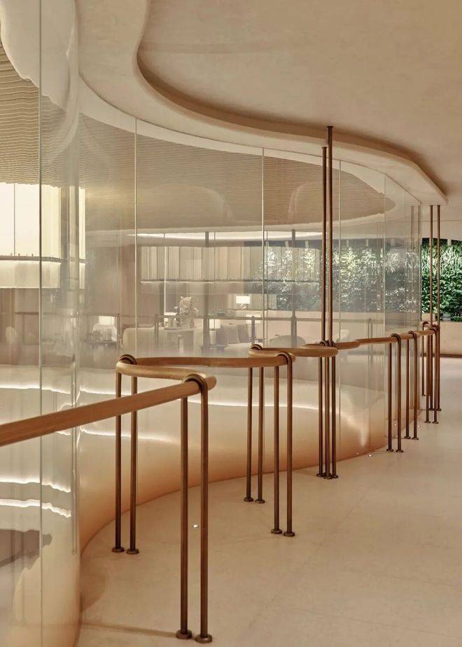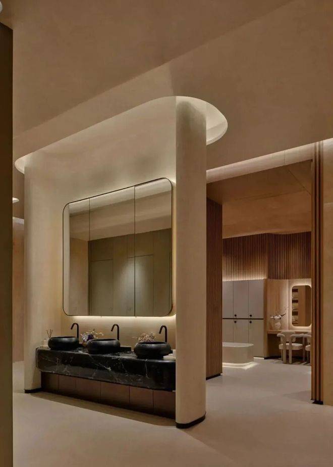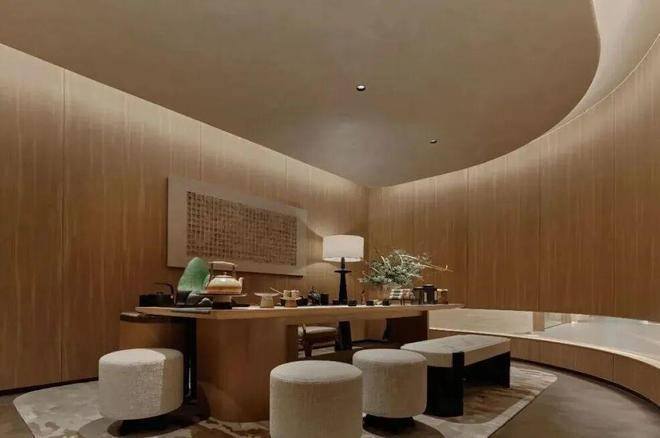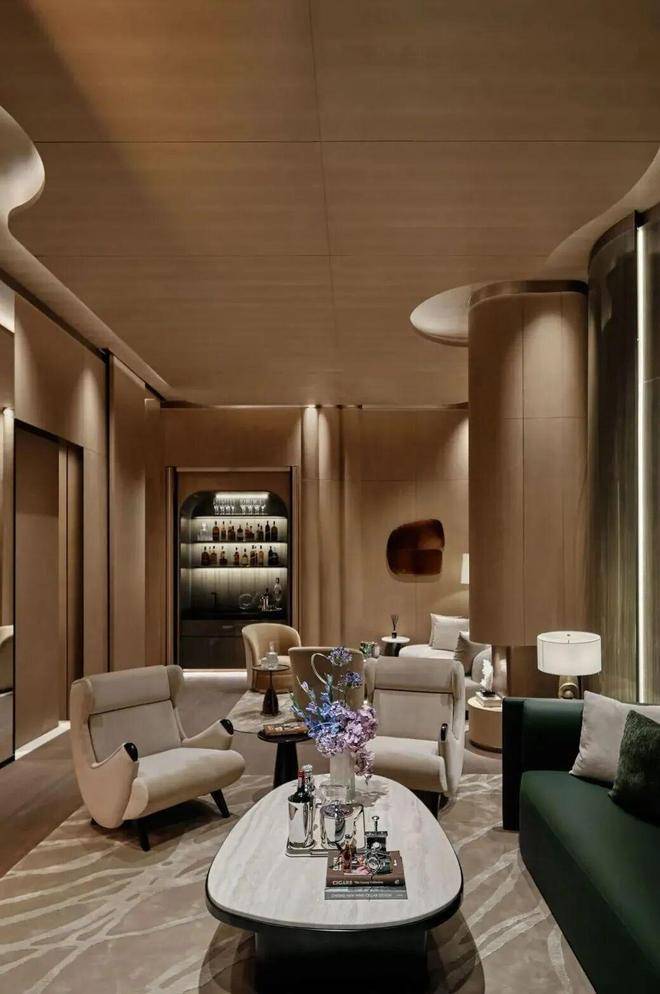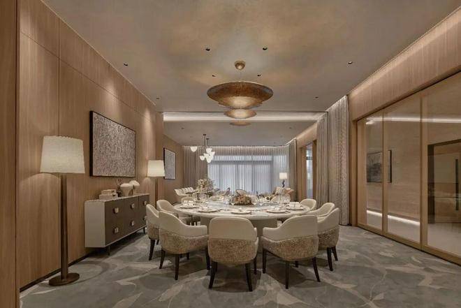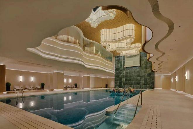 会所功能分区完善,中庭两侧分布着茶室、红酒雪茄吧与宴会厅,宴会厅可实现中式圆桌私宴与西式长案私宴的灵活切换,红酒雪茄吧采用环抱式座椅与弧形沙发,营造出静谧私密的社交氛围。下层空间则配备健身区、瑜伽舞蹈室、SPA疗愈区与恒温泳池,其中恒温泳池采用10米垂直挑高吊顶,搭配不规则天窗,可引入自然天光或模拟不同时段的光影,与北侧瀑布形成虚实呼应,打造出滨水秘境般的体验。
