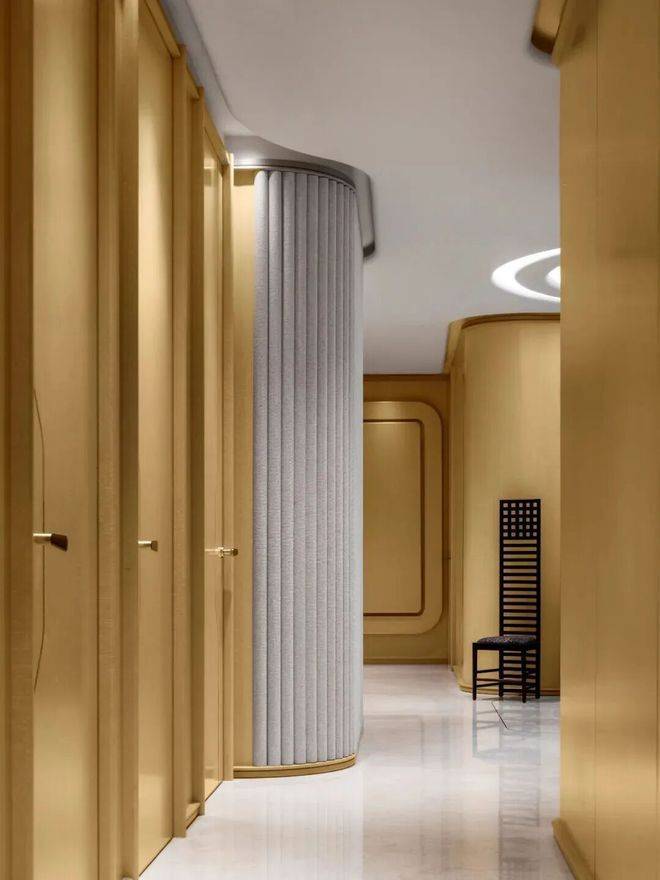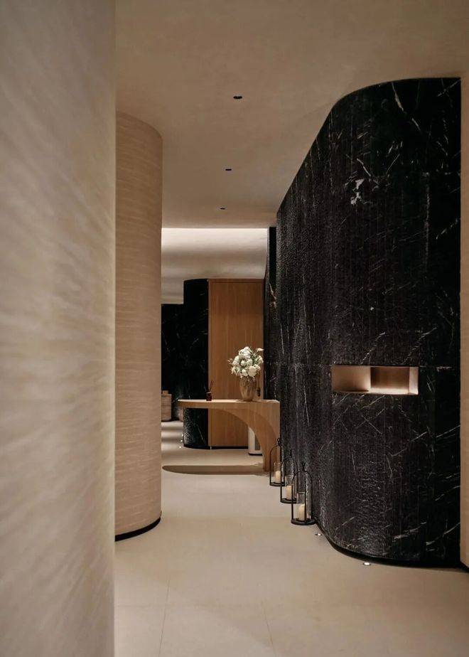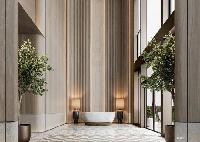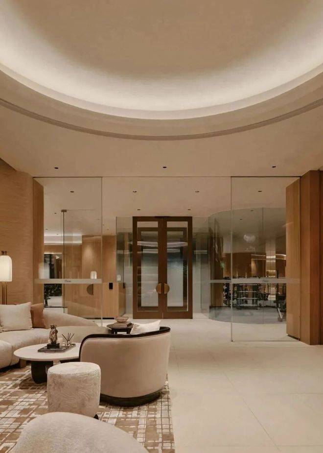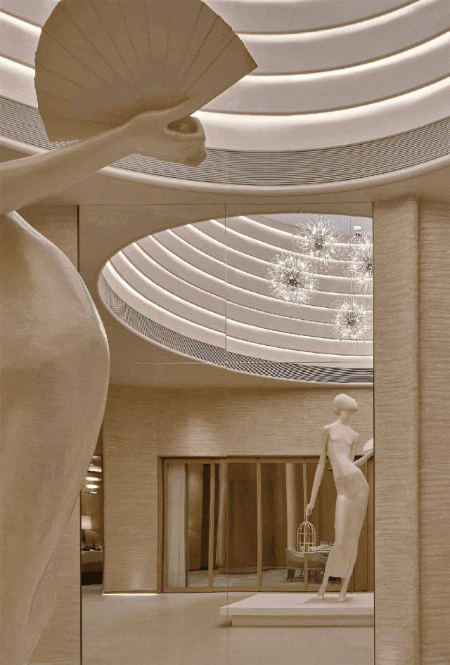 会所作为项目的核心配套,总面积超4000㎡,以“水之韵律”为设计灵感,所有边界均被柔化,没有一条生硬的直线,呈现出流动的呼吸感。迎宾区采用浅色木饰面搭配绿色植物背景,营造出宁静雅致的归家氛围;中庭设置圆形天井,层叠线条如水波,自然光倾泻而下,搭配艺术大师陈逸飞的雕塑作品《东方少女》,形成兼具艺术感与人文气息的核心空间。