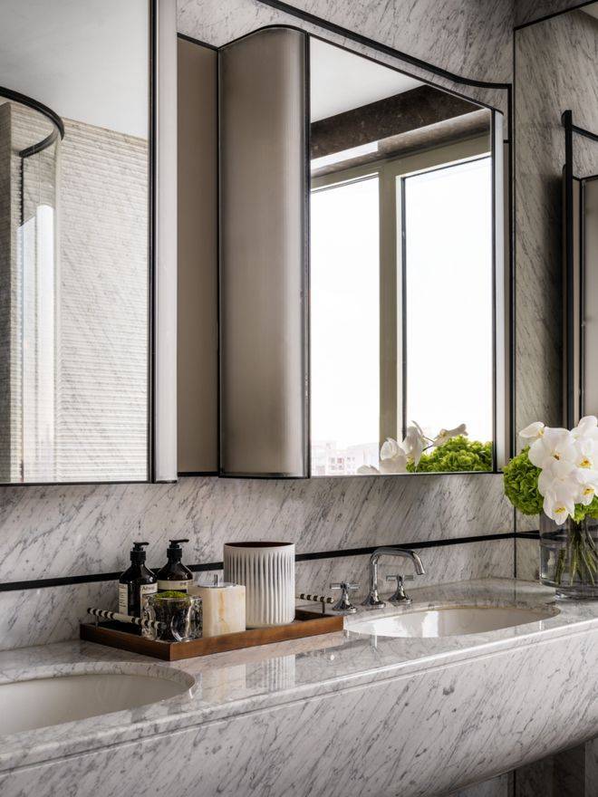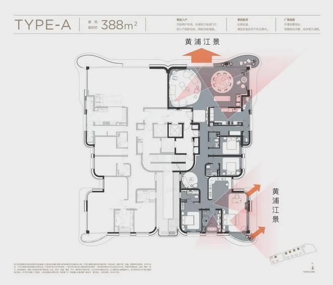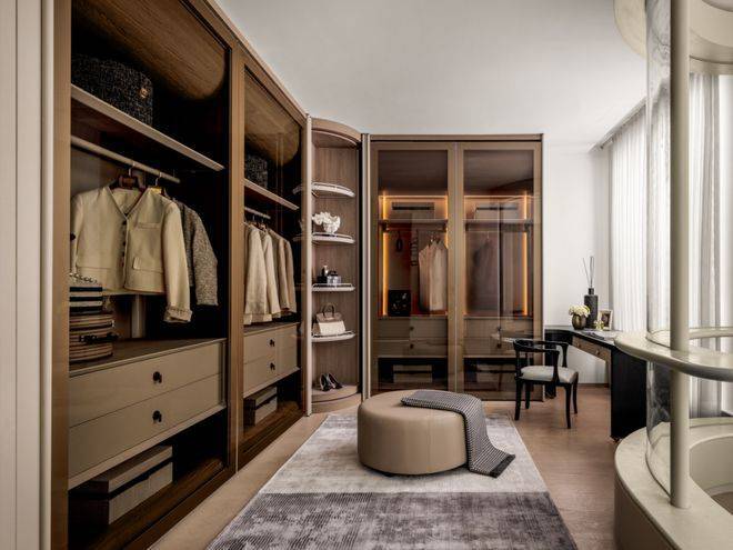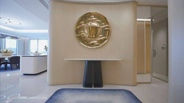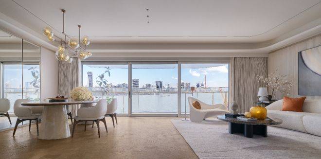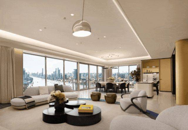 住宅室内则以“江景最大化”为核心,全系打造建面约180-388㎡江景大平层,均为精装交付,甄选嘉格纳厨电、劳芬卫浴、当代五金等国际一线品牌,搭配中央空调、地暖、新风、全屋智能系统。其中,388㎡顶豪户型采用私梯入户、独立家政间设计,超10米南向面宽,主卧套房配备独立衣帽间、双台盆卫浴与观景露台;240㎡户型拥有约8.6米超宽横厅搭配全景落地窗,270°环幕江景视野;180㎡户型则主打全明格局,独立玄关兼顾仪式感与收纳功能,适配不同塔尖人群的需求。