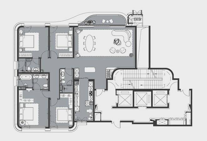 约240㎡ 4房产品,是典型的大面宽产品,临江面的面宽,超16米!超大面宽客厅结合弧形阳台,搭配着270°大面积宽幅全高玻璃窗,将整个滨江景观尽收眼底!