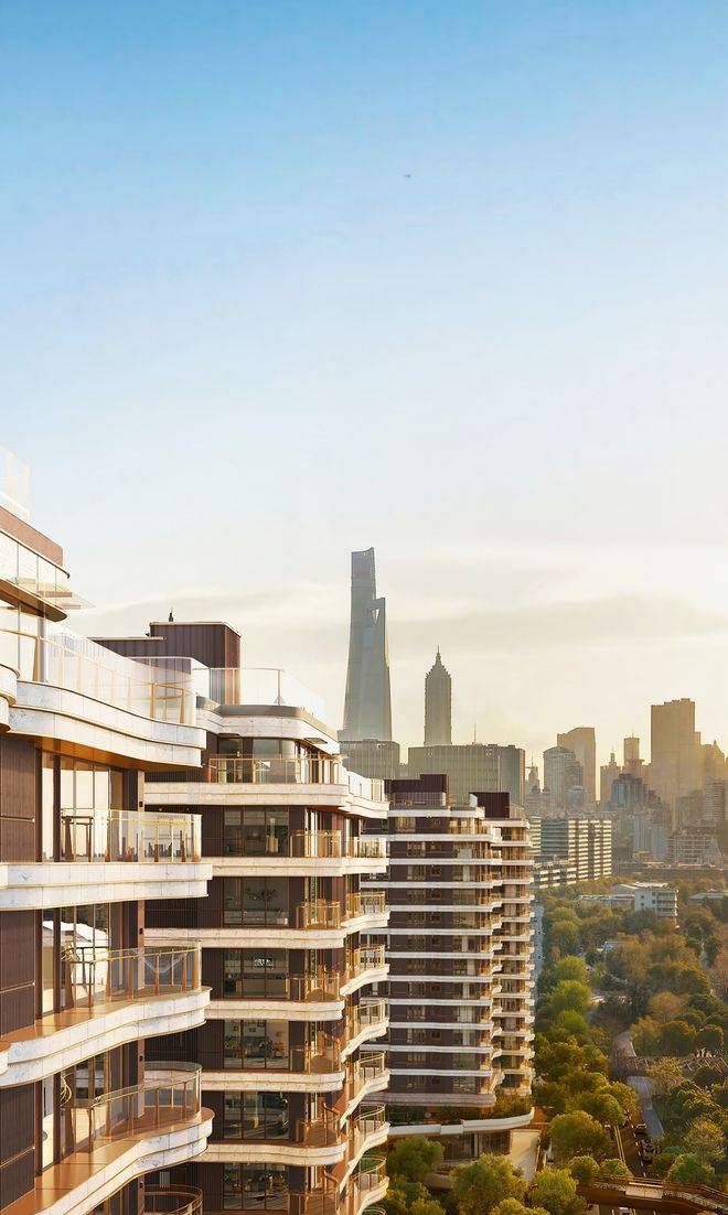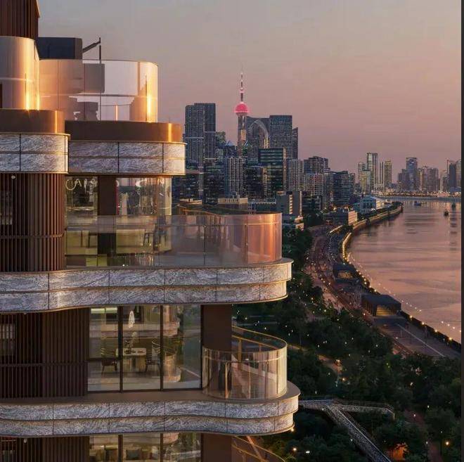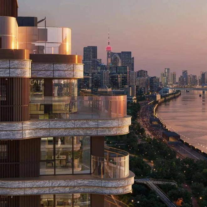 建筑外观以“蝴蝶翅膀”为设计灵感,打造独特的“翼展”户型,平面布局灵活,最大化延伸室内与阳台的视野尺度,让每一户都能充分享有一线江景资源。外立面摒弃繁复装饰,采用简洁流畅的弧形线条,呼应黄浦江的蜿蜒曲线,搭配通透的全景玻璃幕墙,将天空、江水与城市天际线融为一体,白天呈现出轻盈通透的质感,夜晚则在灯光映衬下,如江面上的璀璨明珠,与陆家嘴“三件套”、外滩万国建筑群形成呼应。