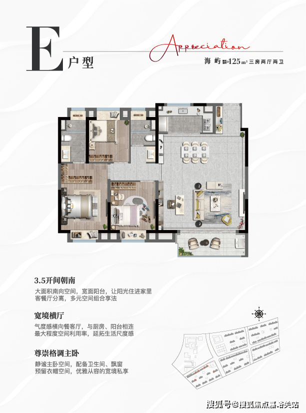 以5+1超级大盘逻辑,将住宅、商业、生活配套有机链接,并将大海的DNA赋予立面、景观等各个维度,打造自成一体的滨海城邦。
