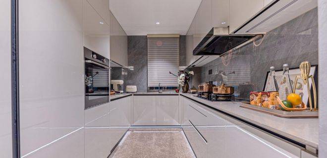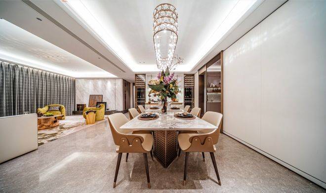 客餐厅、厨房、卫生间、阳台地面铺设的都是塞浦路斯灰天然大理石;电视背景墙一般项目都不交付,项目140㎡户型采用大块岩板.